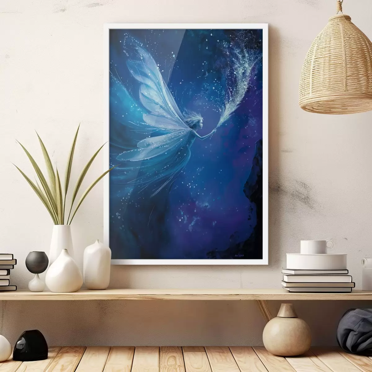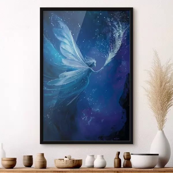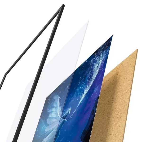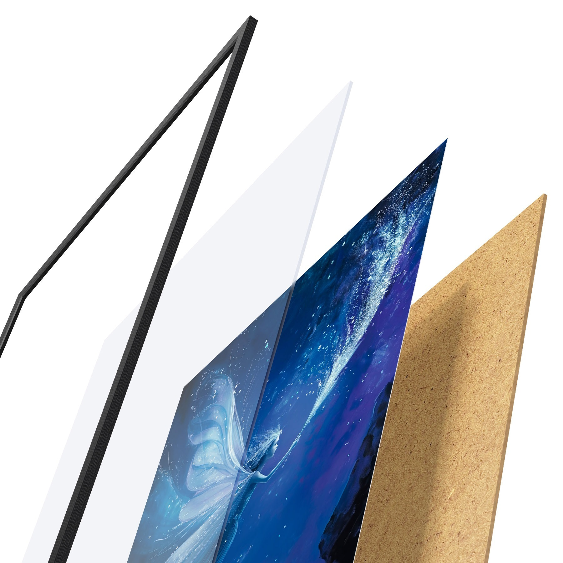 De poster bestaat uit een frame, plexiglas, geprinte afbeelding en spaanplaat achterkant. De poster kan meteen aan de muur worden gehangen dankzij de bevestigingen op de achterkant.
