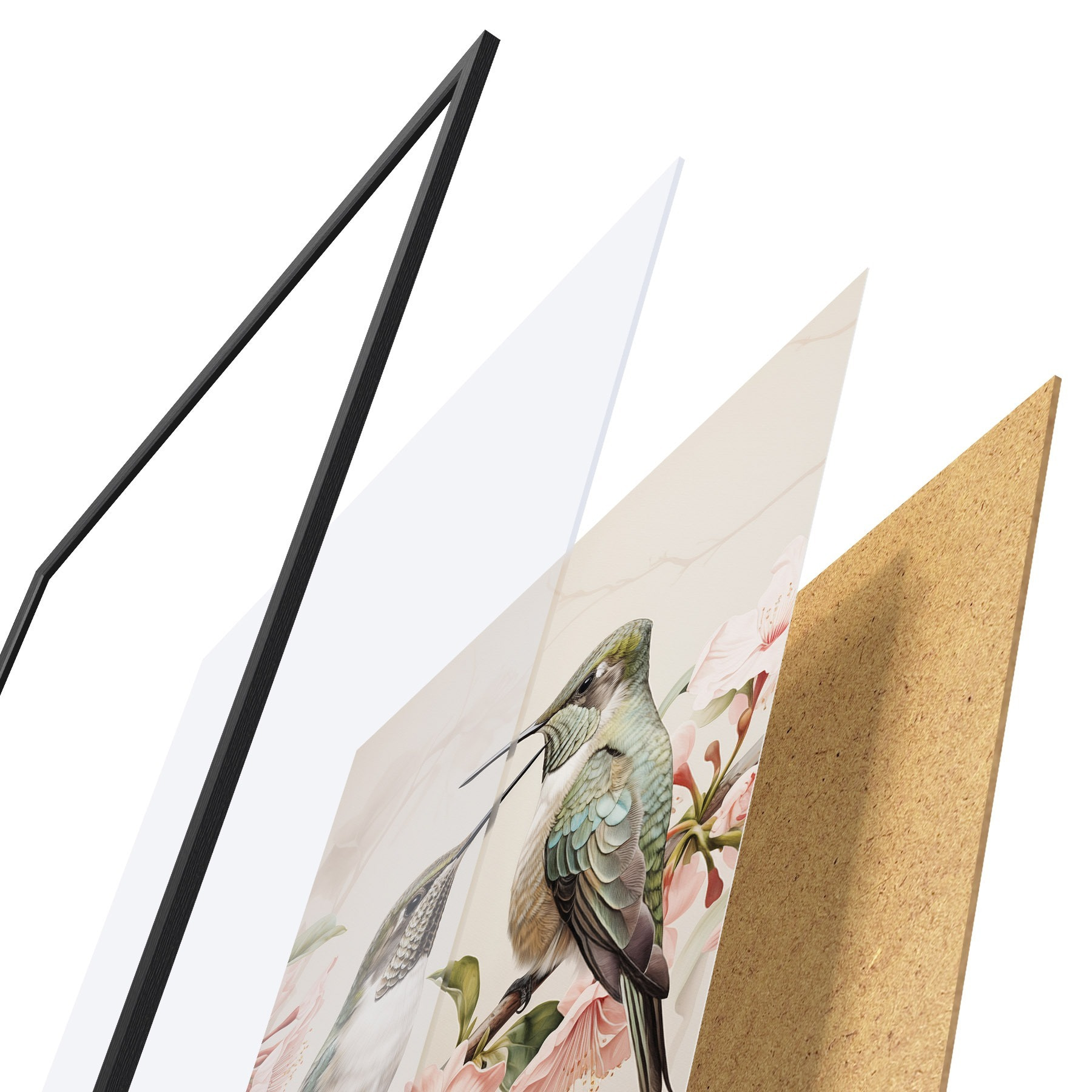 De poster bestaat uit een frame, plexiglas, geprinte afbeelding en spaanplaat achterkant. De poster kan meteen aan de muur worden gehangen dankzij de bevestigingen op de achterkant.