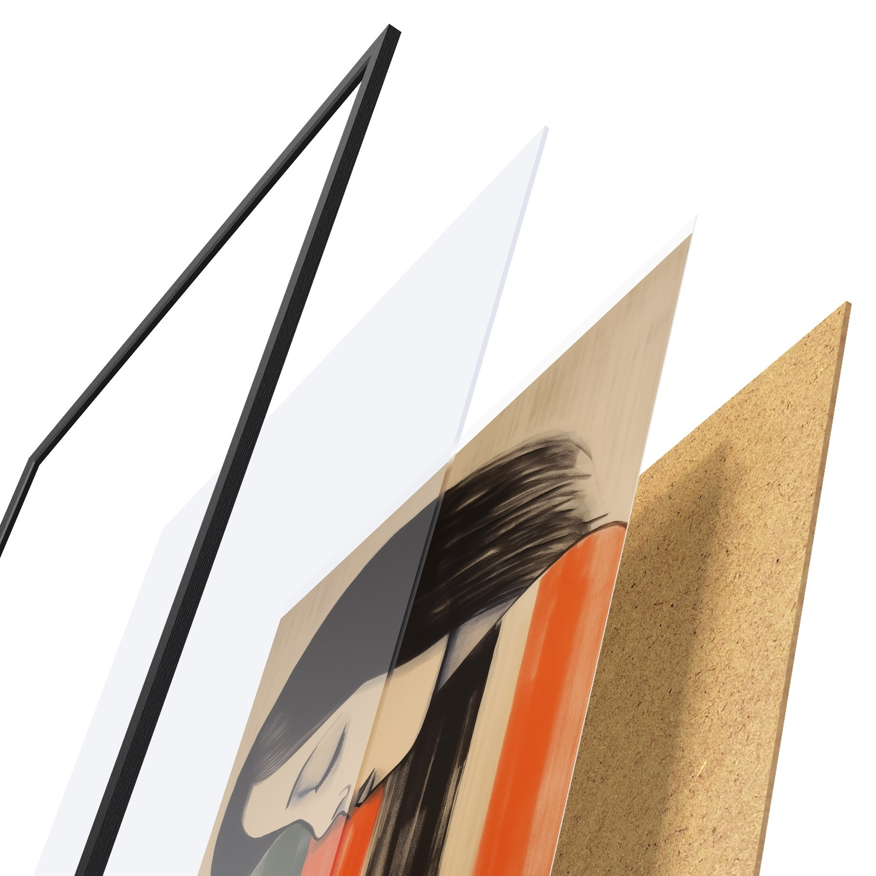 De poster bestaat uit een frame, plexiglas, geprinte afbeelding en spaanplaat achterkant. De poster kan meteen aan de muur worden gehangen dankzij de bevestigingen op de achterkant.