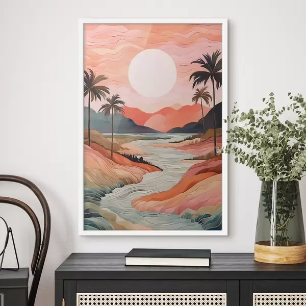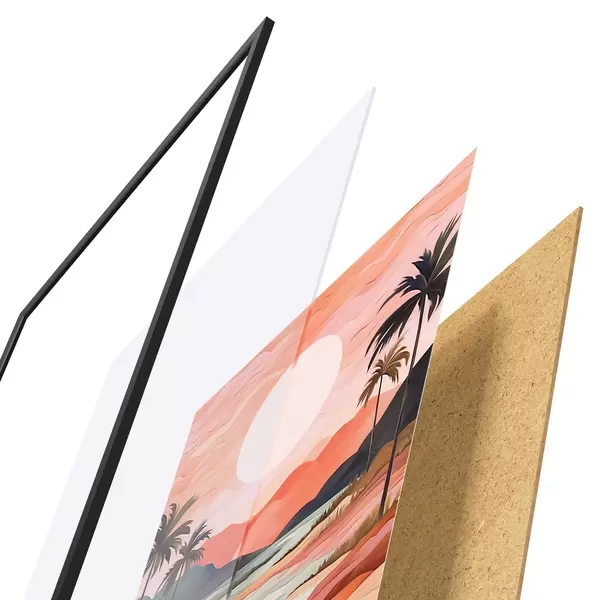 De poster bestaat uit een frame, plexiglas, geprinte afbeelding en spaanplaat achterkant. De poster kan meteen aan de muur worden gehangen dankzij de bevestigingen op de achterkant.