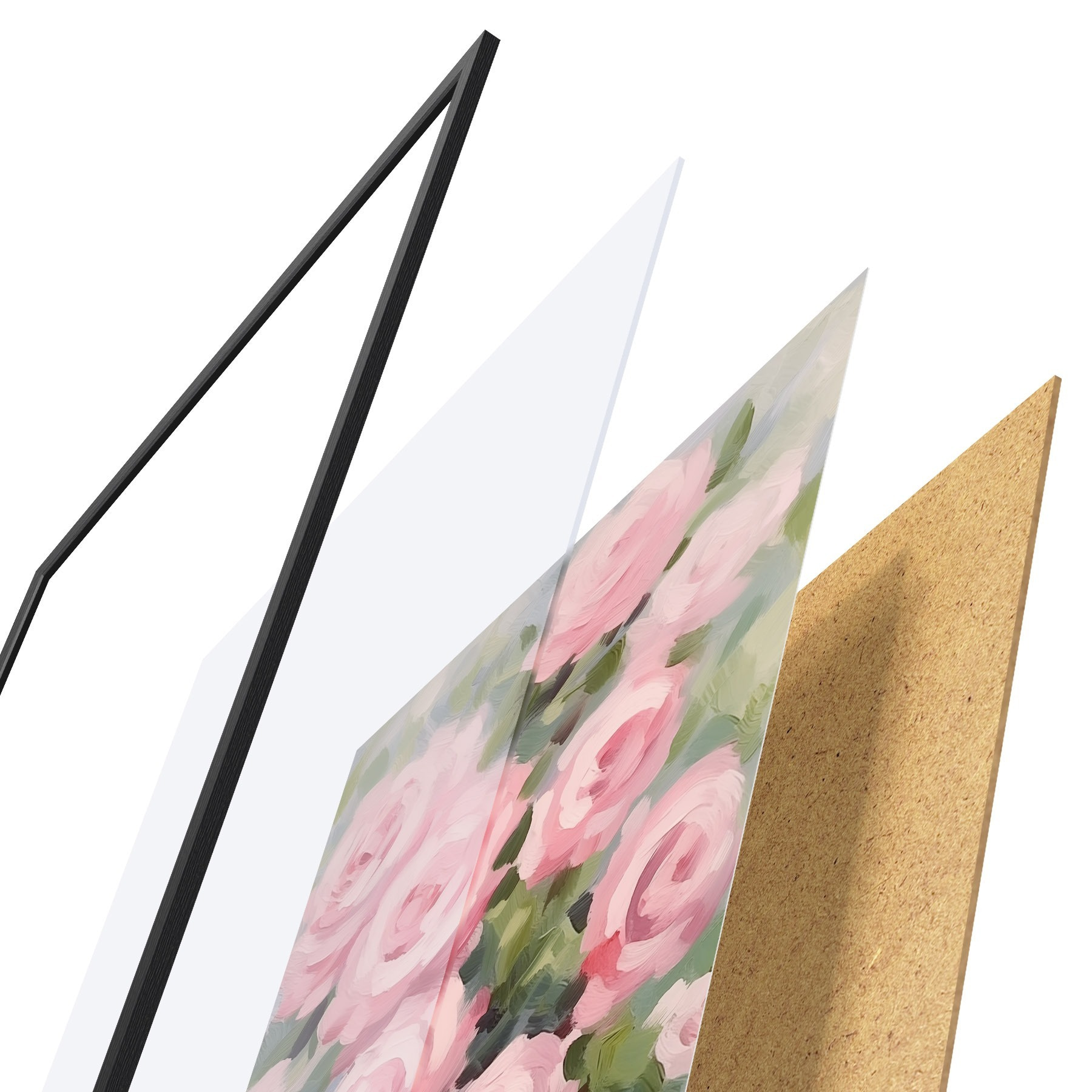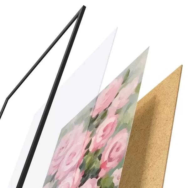 De poster bestaat uit een frame, plexiglas, geprinte afbeelding en spaanplaat achterkant. De poster kan meteen aan de muur worden gehangen dankzij de bevestigingen op de achterkant.