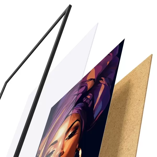 De poster bestaat uit een frame, plexiglas, geprinte afbeelding en spaanplaat achterkant. De poster kan meteen aan de muur worden gehangen dankzij de bevestigingen op de achterkant.