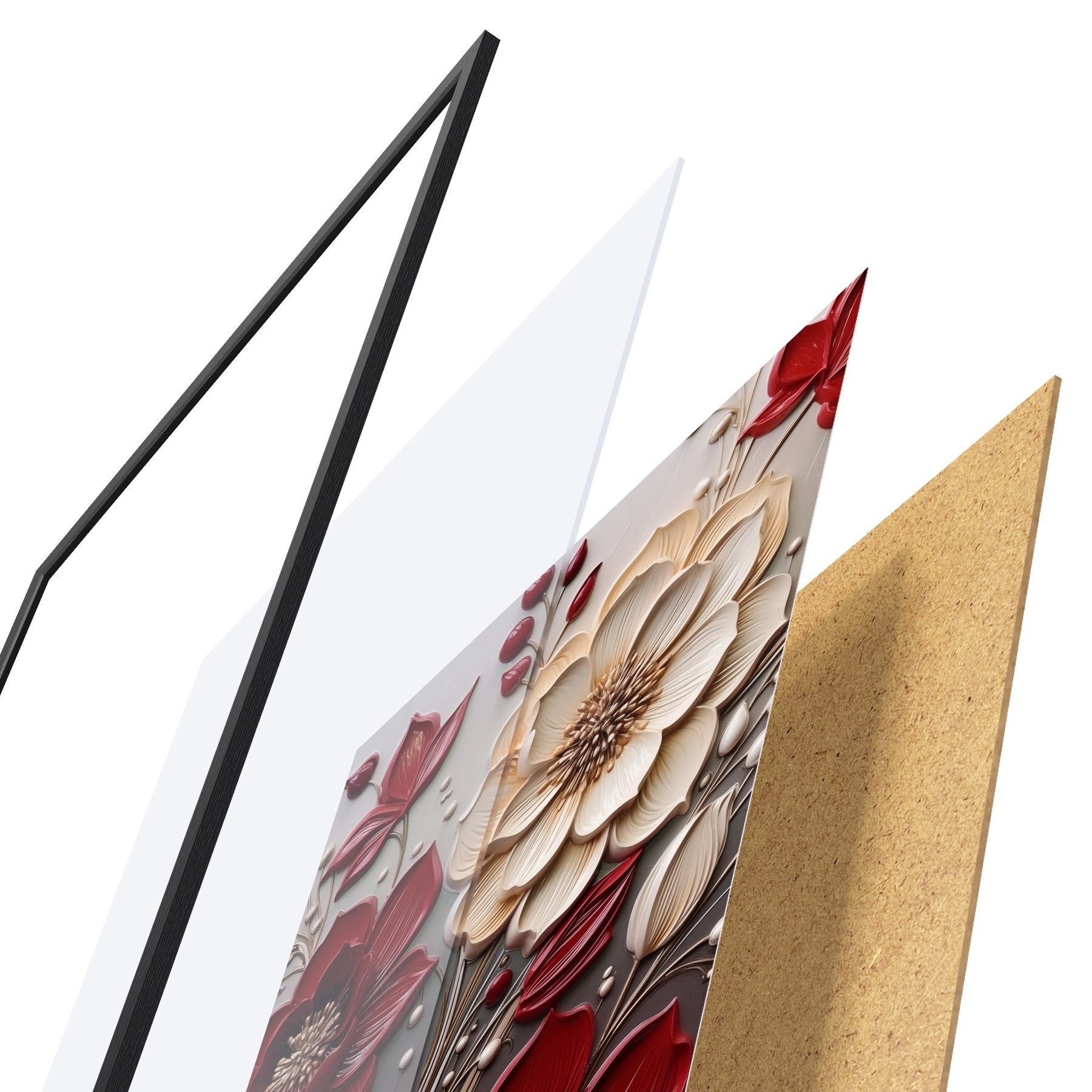 De poster bestaat uit een frame, plexiglas, geprinte afbeelding en spaanplaat achterkant. De poster kan meteen aan de muur worden gehangen dankzij de bevestigingen op de achterkant.