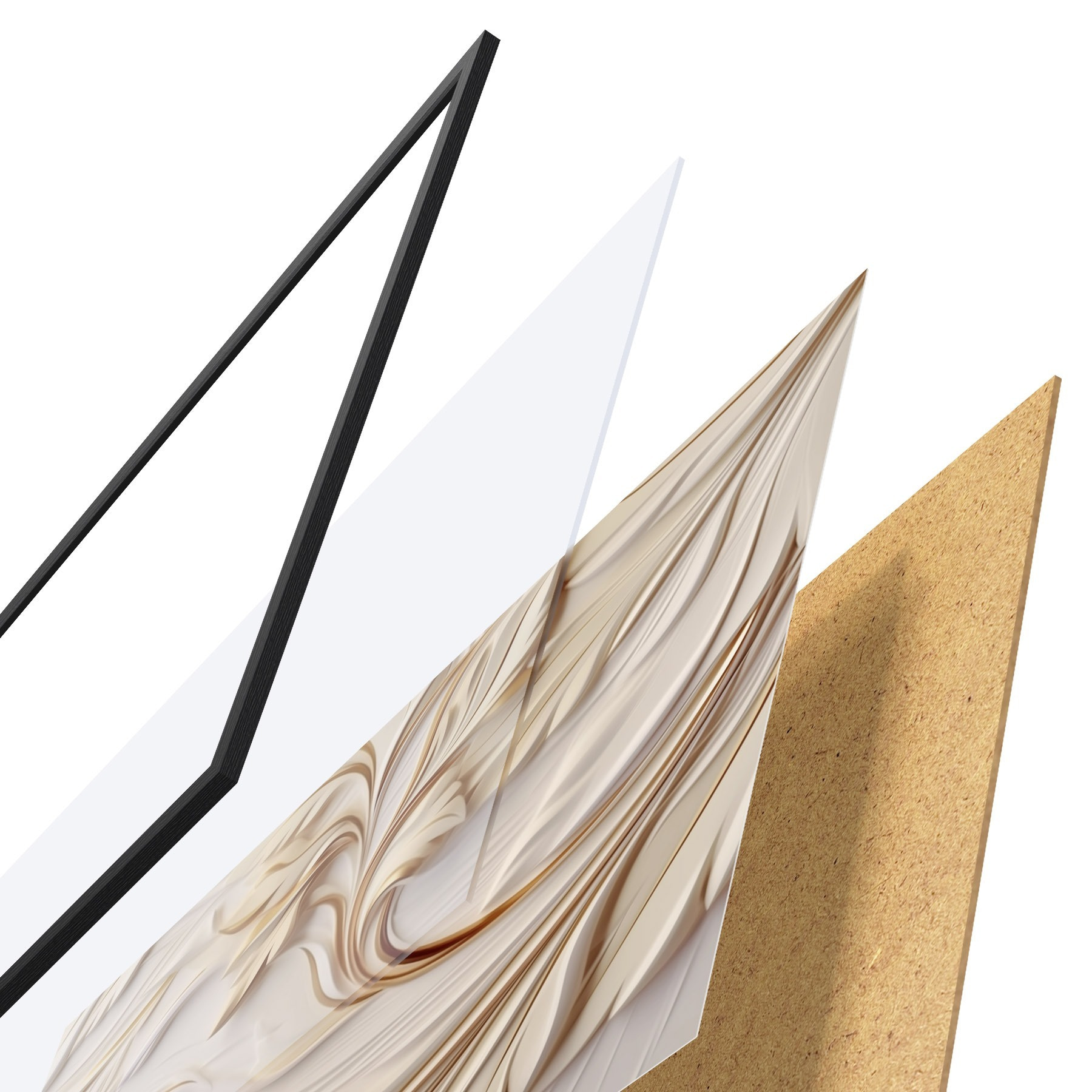 De poster bestaat uit een frame, plexiglas, geprinte afbeelding en spaanplaat achterkant. De poster kan meteen aan de muur worden gehangen dankzij de bevestigingen op de achterkant.