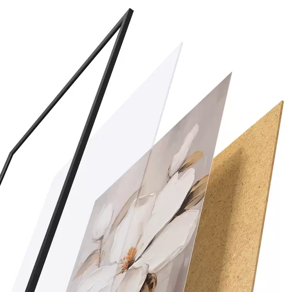 De poster bestaat uit een frame, plexiglas, geprinte afbeelding en spaanplaat achterkant. De poster kan meteen aan de muur worden gehangen dankzij de bevestigingen op de achterkant.