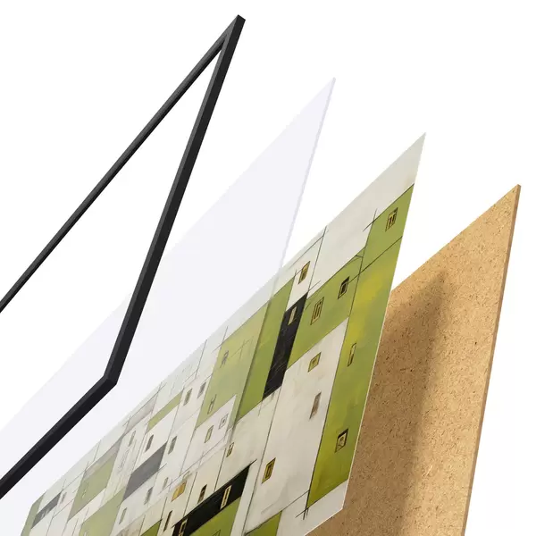 De poster bestaat uit een frame, plexiglas, geprinte afbeelding en spaanplaat achterkant. De poster kan meteen aan de muur worden gehangen dankzij de bevestigingen op de achterkant.