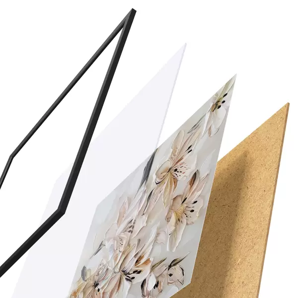 De poster bestaat uit een frame, plexiglas, geprinte afbeelding en spaanplaat achterkant. De poster kan meteen aan de muur worden gehangen dankzij de bevestigingen op de achterkant.