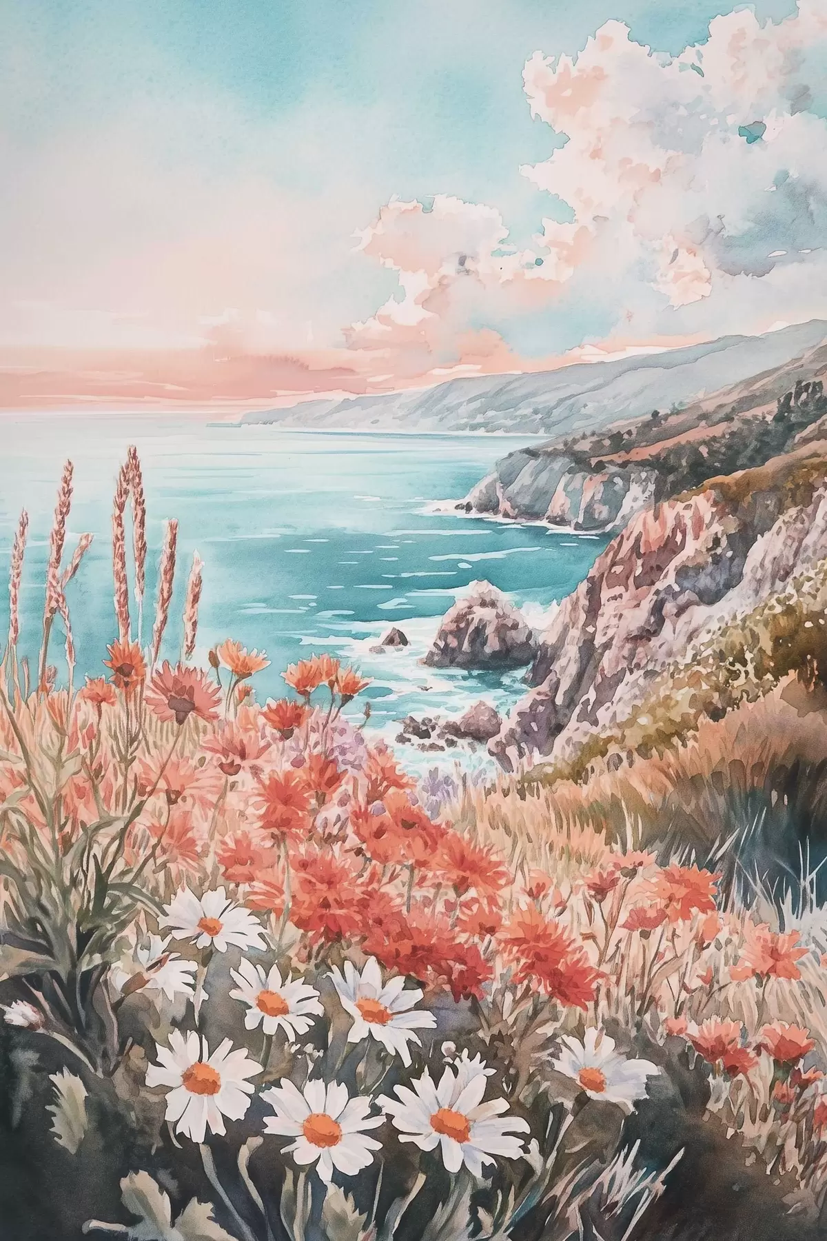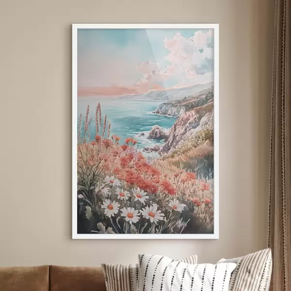 Poster Portugal oceaan kust op de zonsondergang, weide bloemen f44612