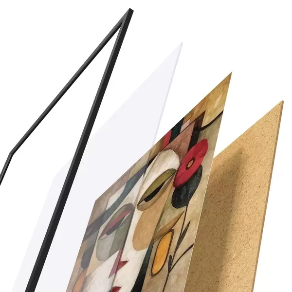 De poster bestaat uit een frame, plexiglas, geprinte afbeelding en spaanplaat achterkant. De poster kan meteen aan de muur worden gehangen dankzij de bevestigingen op de achterkant.