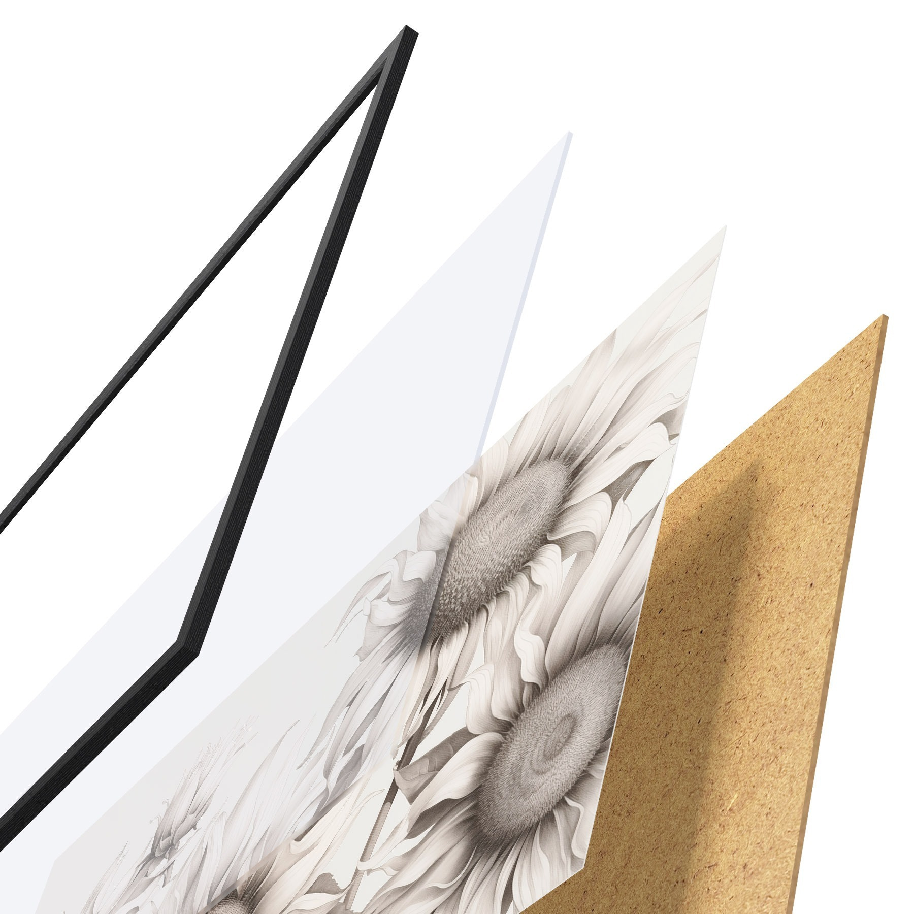 De poster bestaat uit een frame, plexiglas, geprinte afbeelding en spaanplaat achterkant. De poster kan meteen aan de muur worden gehangen dankzij de bevestigingen op de achterkant.