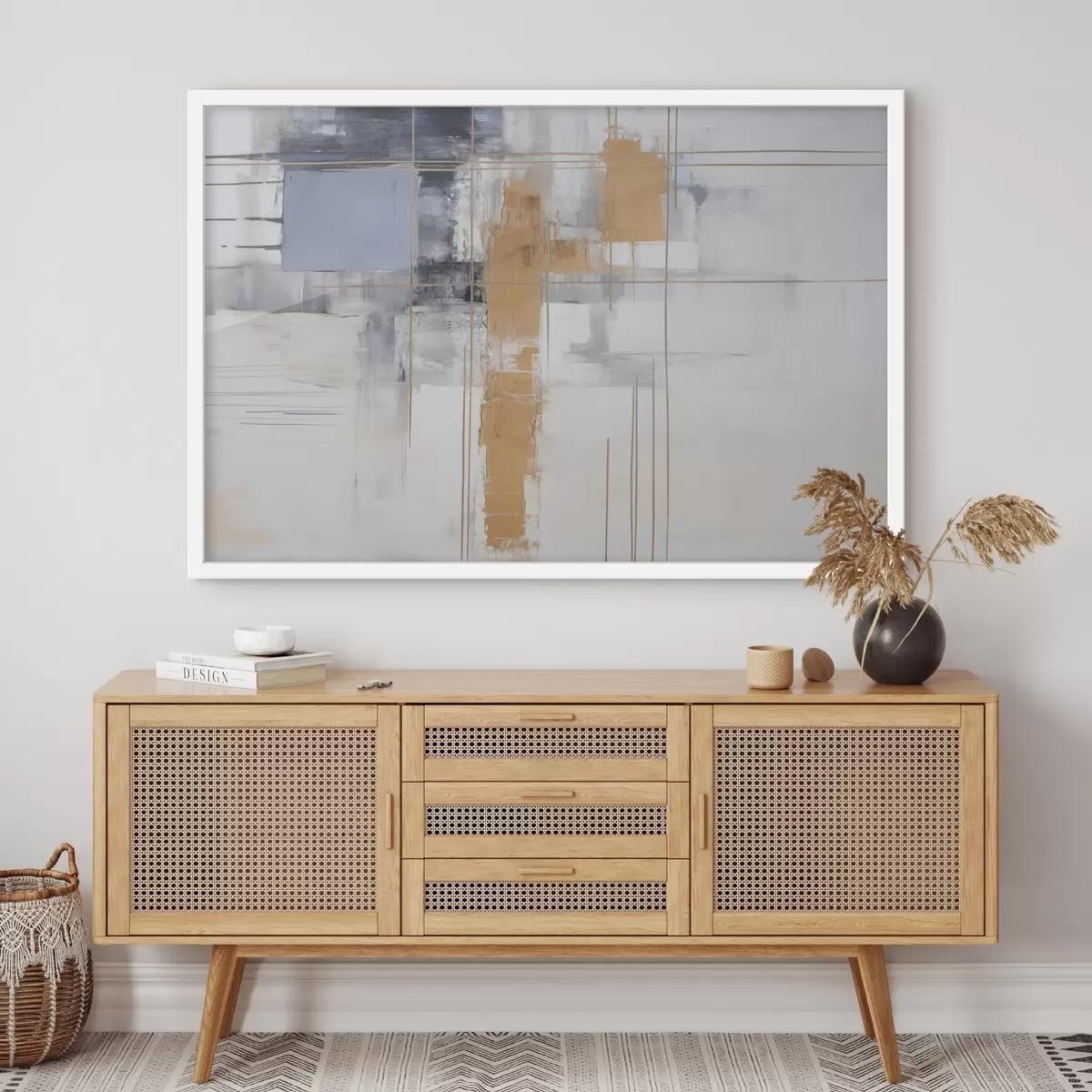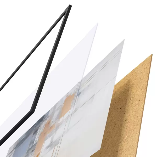 De poster bestaat uit een frame, plexiglas, geprinte afbeelding en spaanplaat achterkant. De poster kan meteen aan de muur worden gehangen dankzij de bevestigingen op de achterkant.