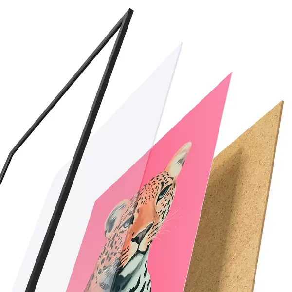 De poster bestaat uit een frame, plexiglas, geprinte afbeelding en spaanplaat achterkant. De poster kan meteen aan de muur worden gehangen dankzij de bevestigingen op de achterkant.