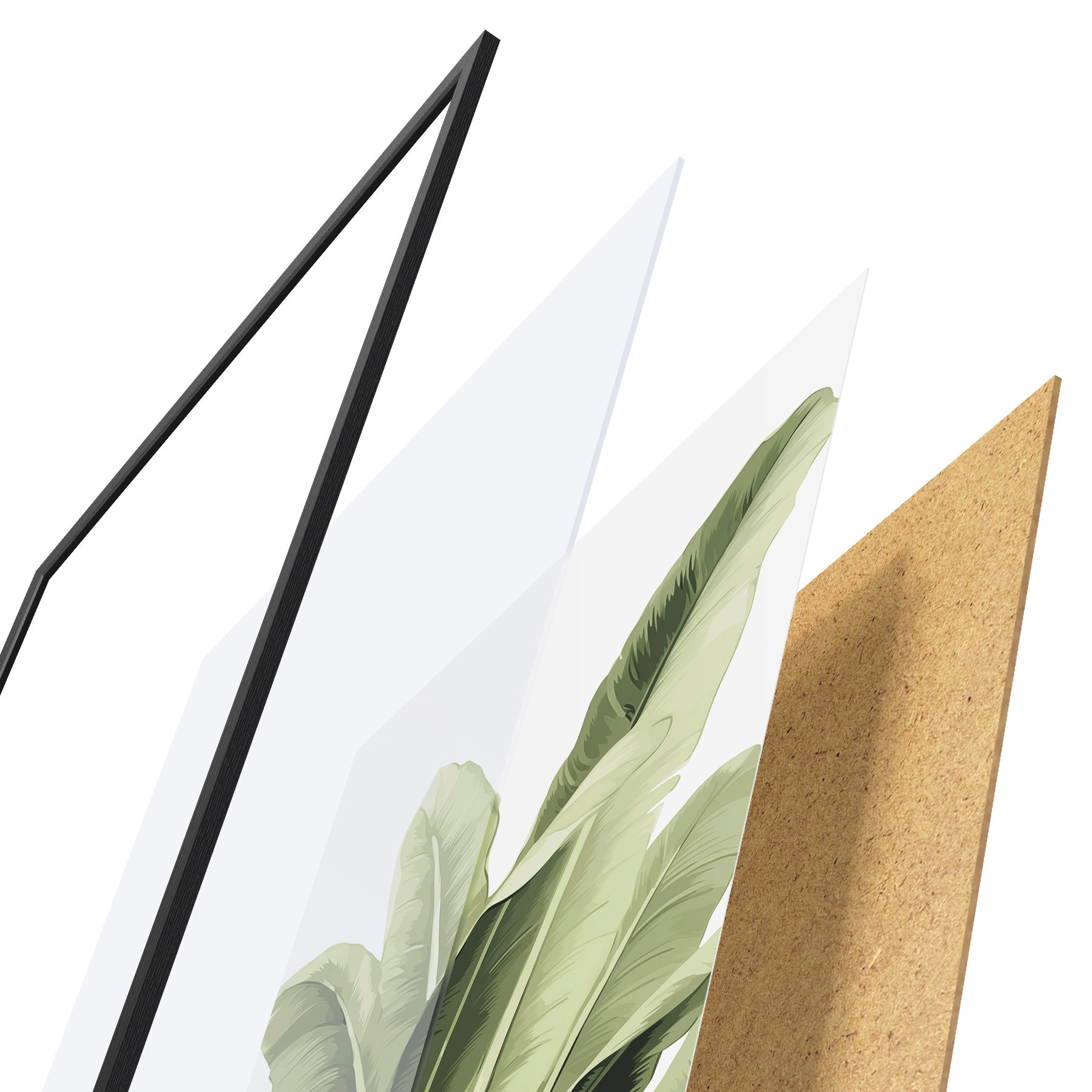 De poster bestaat uit een frame, plexiglas, geprinte afbeelding en spaanplaat achterkant. De poster kan meteen aan de muur worden gehangen dankzij de bevestigingen op de achterkant.