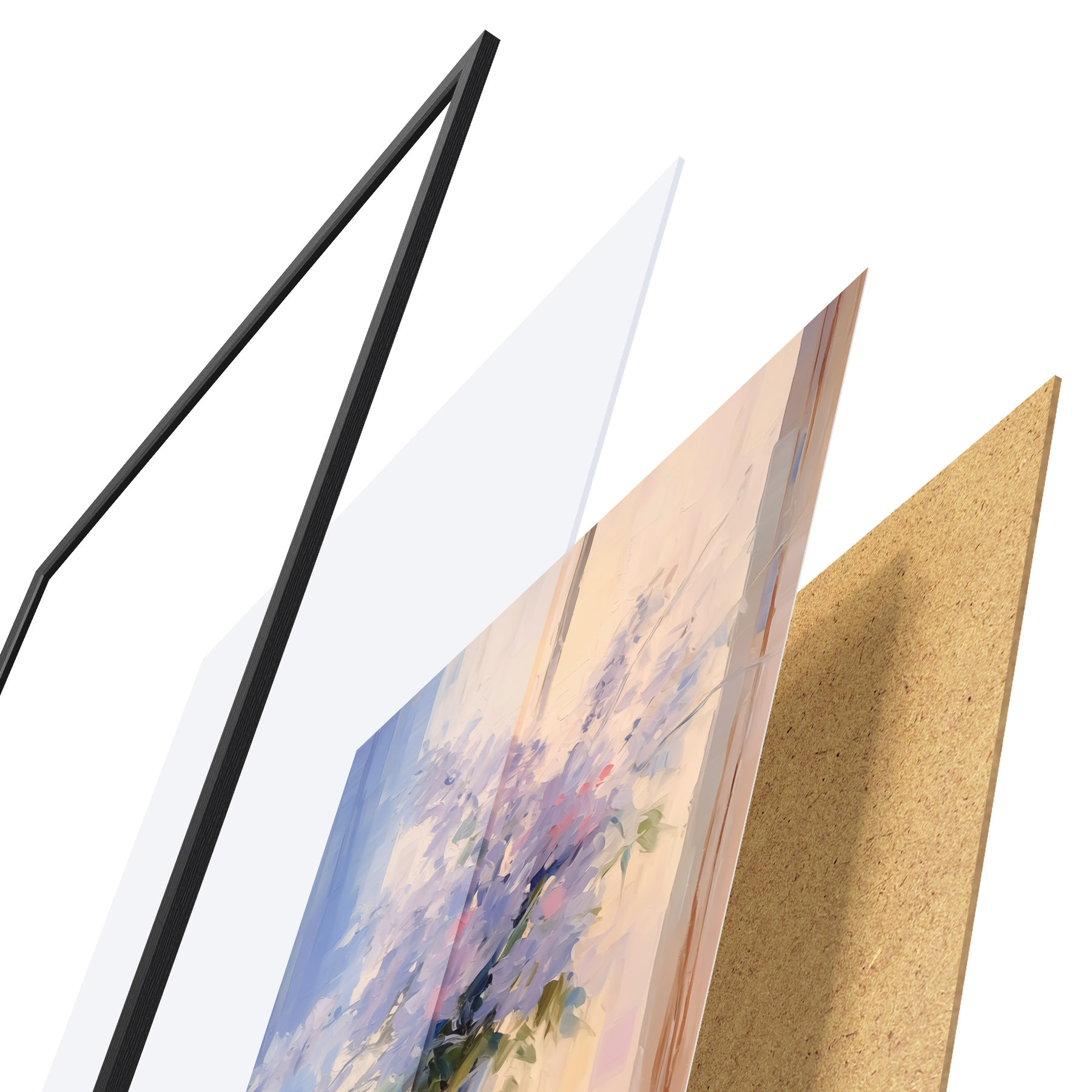 De poster bestaat uit een frame, plexiglas, geprinte afbeelding en spaanplaat achterkant. De poster kan meteen aan de muur worden gehangen dankzij de bevestigingen op de achterkant.