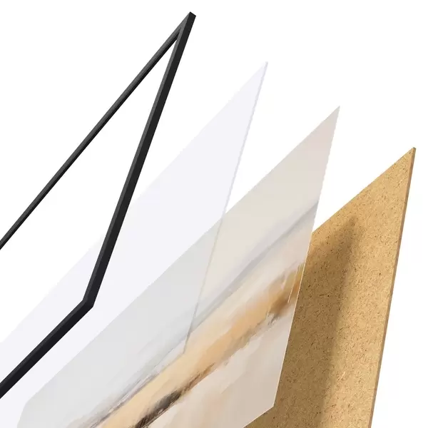 De poster bestaat uit een frame, plexiglas, geprinte afbeelding en spaanplaat achterkant. De poster kan meteen aan de muur worden gehangen dankzij de bevestigingen op de achterkant.