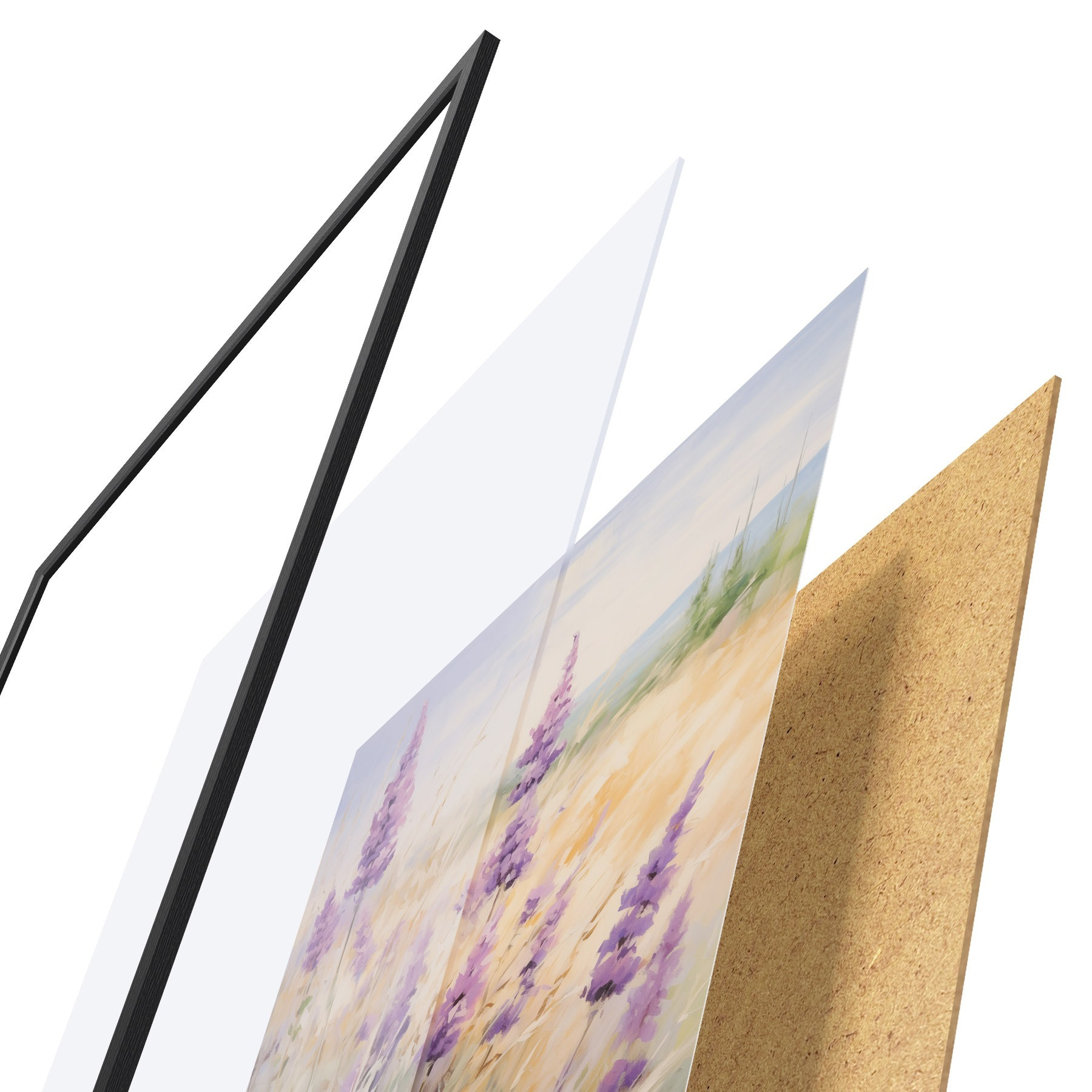 De poster bestaat uit een frame, plexiglas, geprinte afbeelding en spaanplaat achterkant. De poster kan meteen aan de muur worden gehangen dankzij de bevestigingen op de achterkant.