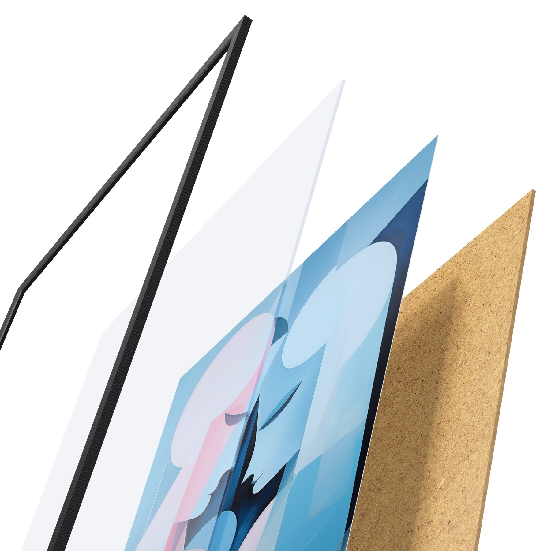 De poster bestaat uit een frame, plexiglas, geprinte afbeelding en spaanplaat achterkant. De poster kan meteen aan de muur worden gehangen dankzij de bevestigingen op de achterkant.