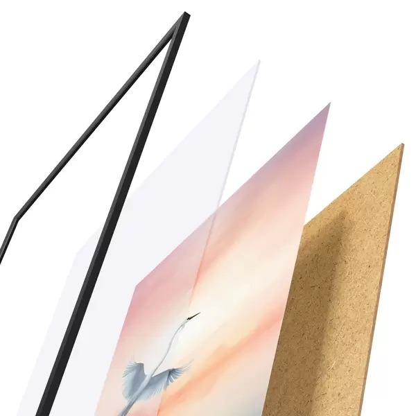De poster bestaat uit een frame, plexiglas, geprinte afbeelding en spaanplaat achterkant. De poster kan meteen aan de muur worden gehangen dankzij de bevestigingen op de achterkant.