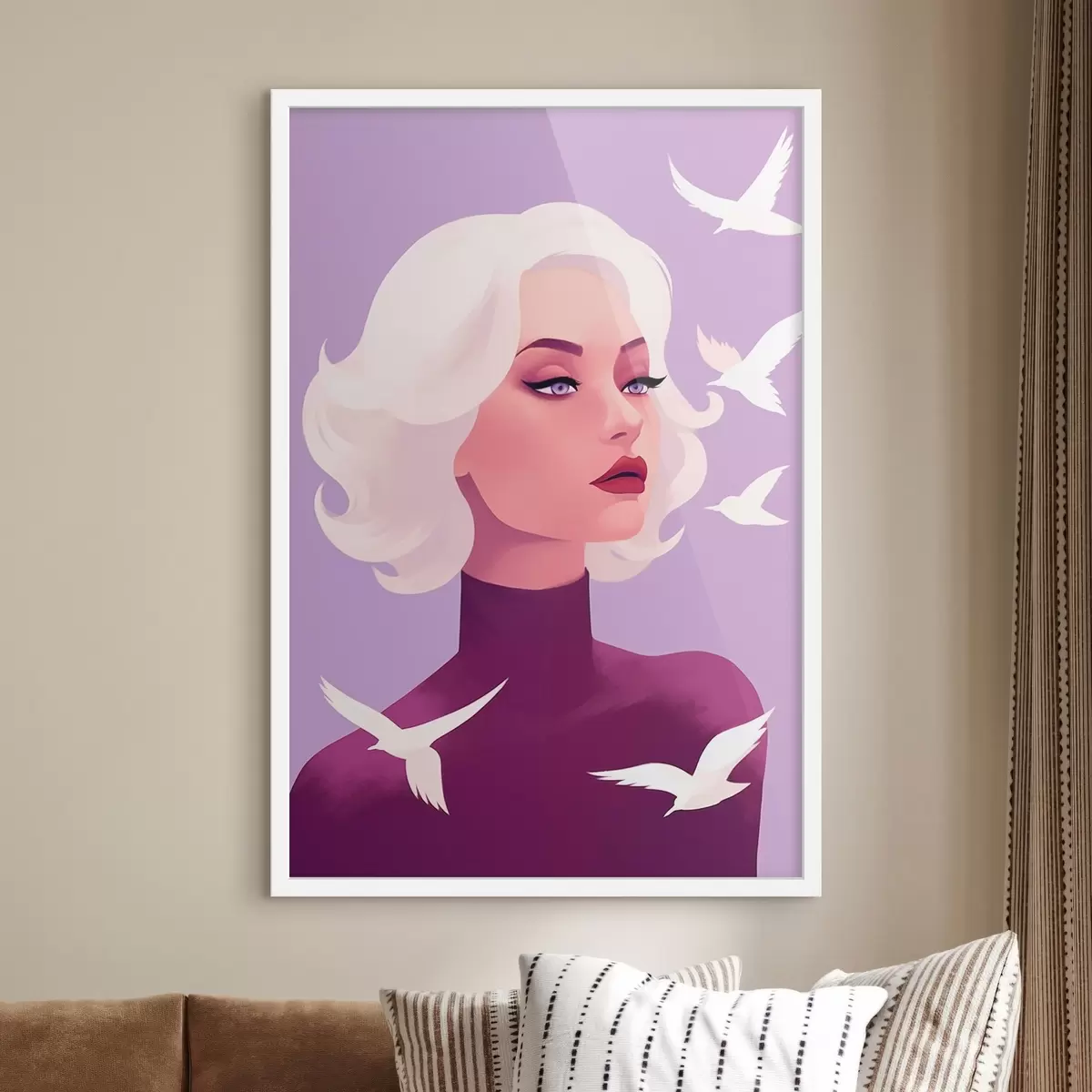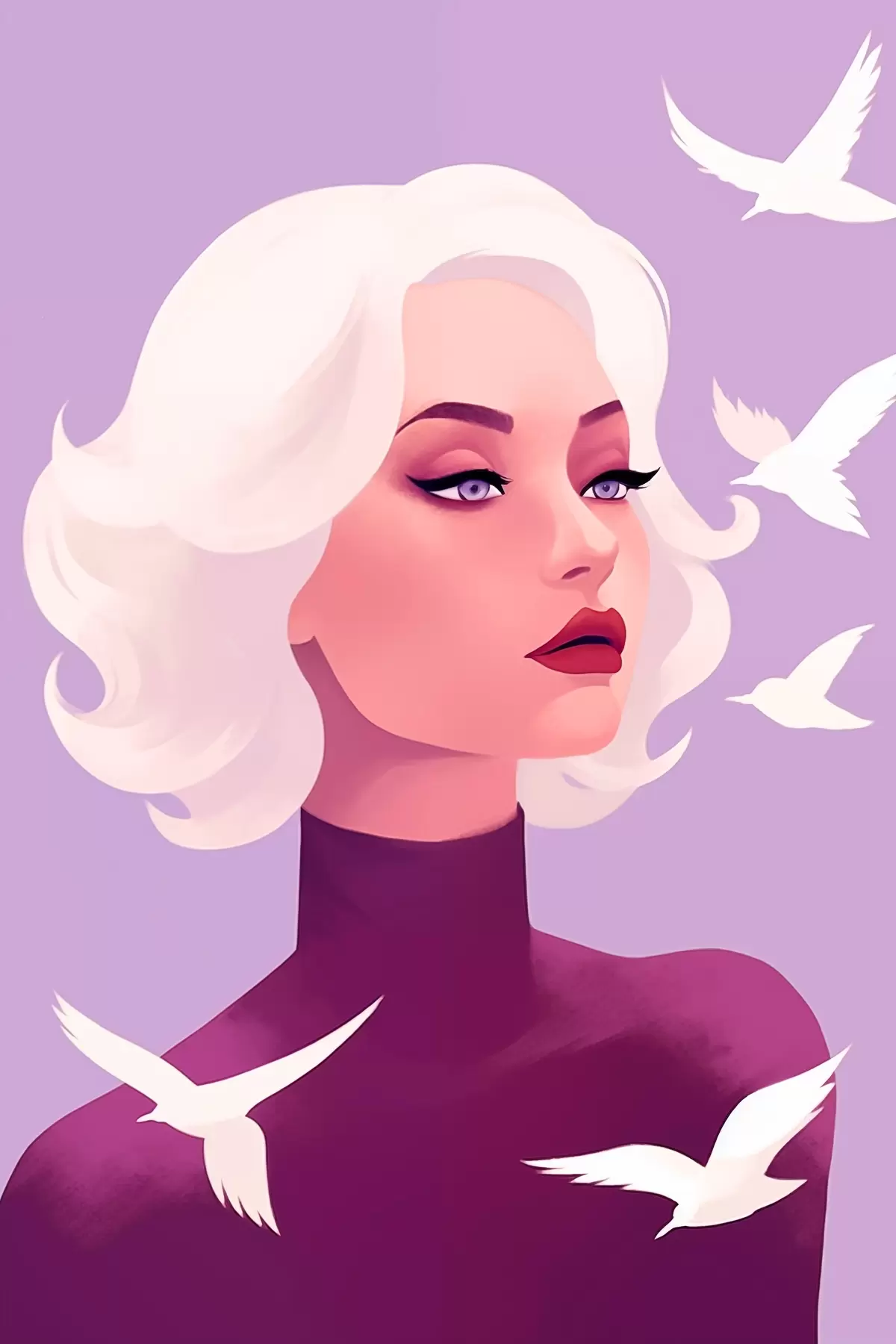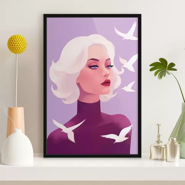 Poster Vrouwenportret met wit haar op de achtergrond met vogels f44681