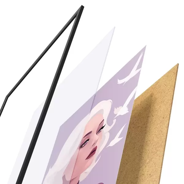 De poster bestaat uit een frame, plexiglas, geprinte afbeelding en spaanplaat achterkant. De poster kan meteen aan de muur worden gehangen dankzij de bevestigingen op de achterkant.