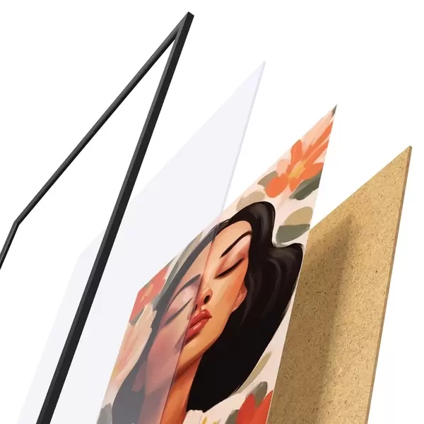 De poster bestaat uit een frame, plexiglas, geprinte afbeelding en spaanplaat achterkant. De poster kan meteen aan de muur worden gehangen dankzij de bevestigingen op de achterkant.