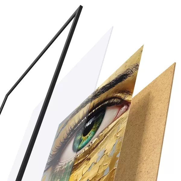 De poster bestaat uit een frame, plexiglas, geprinte afbeelding en spaanplaat achterkant. De poster kan meteen aan de muur worden gehangen dankzij de bevestigingen op de achterkant.