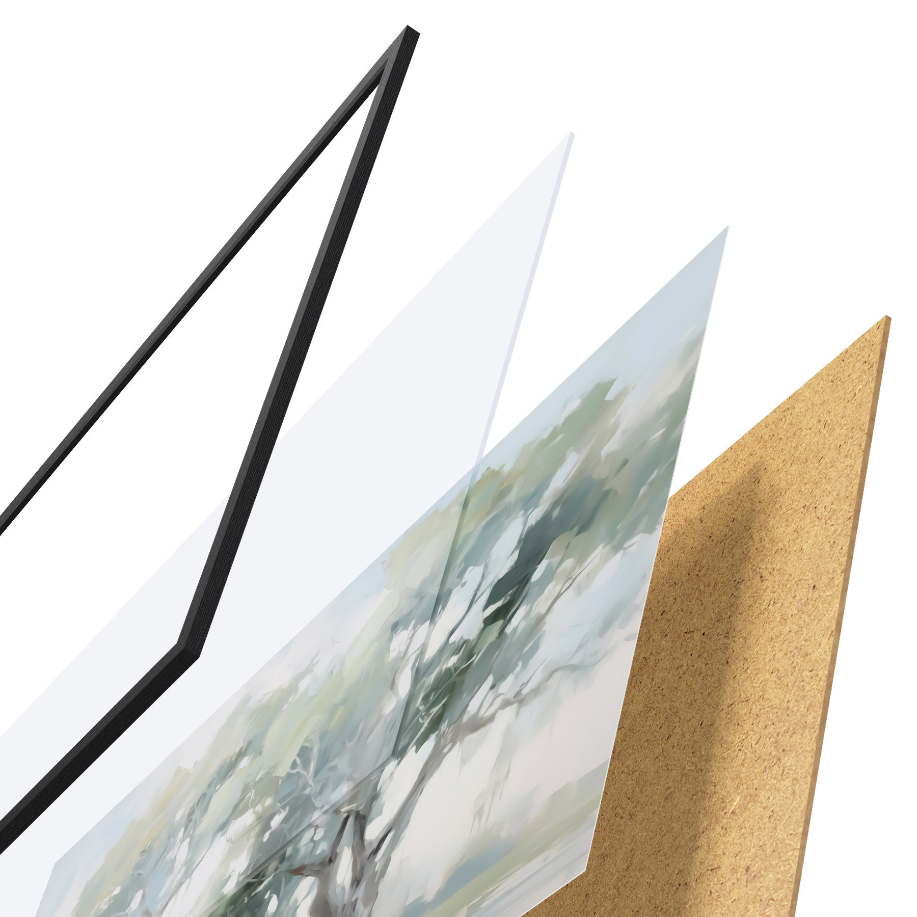 De poster bestaat uit een frame, plexiglas, geprinte afbeelding en spaanplaat achterkant. De poster kan meteen aan de muur worden gehangen dankzij de bevestigingen op de achterkant.