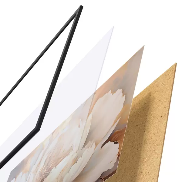 De poster bestaat uit een frame, plexiglas, geprinte afbeelding en spaanplaat achterkant. De poster kan meteen aan de muur worden gehangen dankzij de bevestigingen op de achterkant.