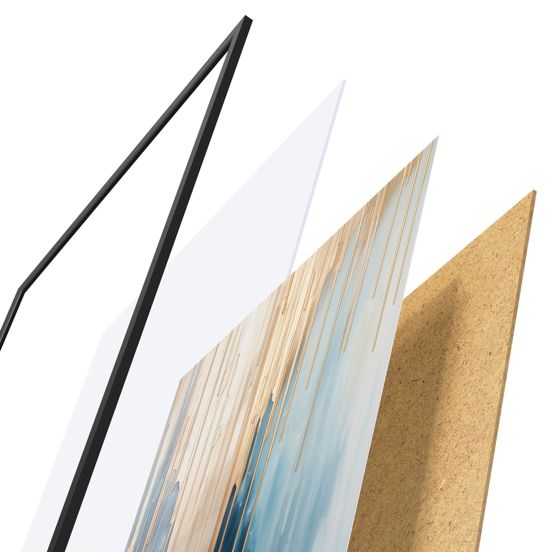 De poster bestaat uit een frame, plexiglas, geprinte afbeelding en spaanplaat achterkant. De poster kan meteen aan de muur worden gehangen dankzij de bevestigingen op de achterkant.