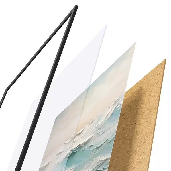 De poster bestaat uit een frame, plexiglas, geprinte afbeelding en spaanplaat achterkant. De poster kan meteen aan de muur worden gehangen dankzij de bevestigingen op de achterkant.