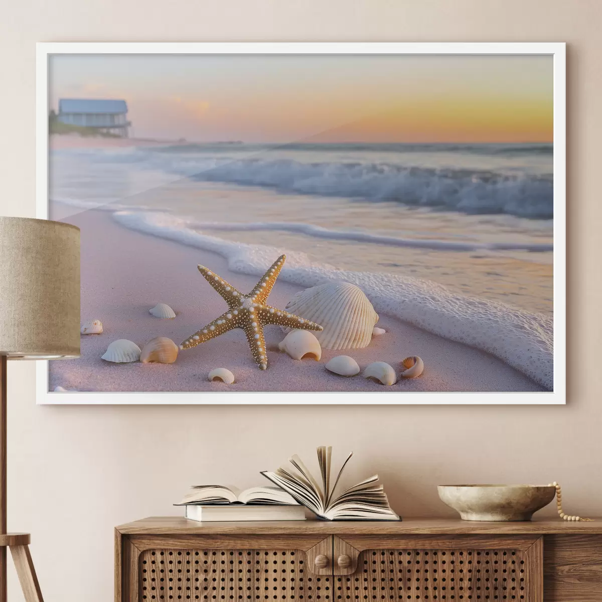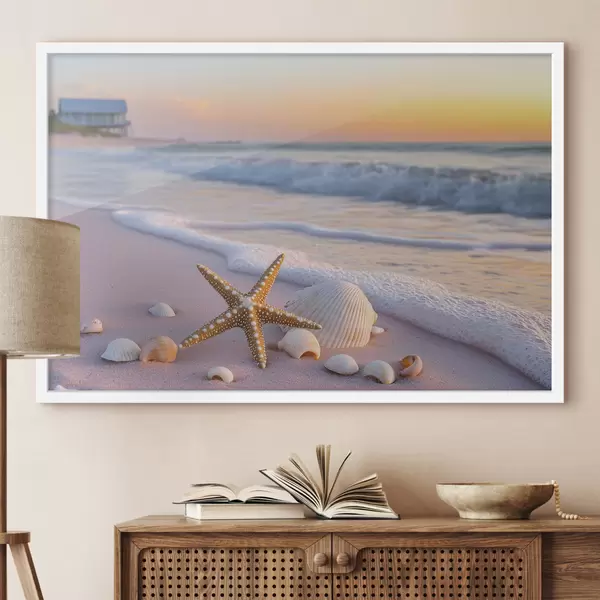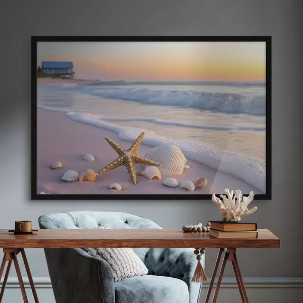 Poster Zeekust met zeesterren, schelpen en golven f44714