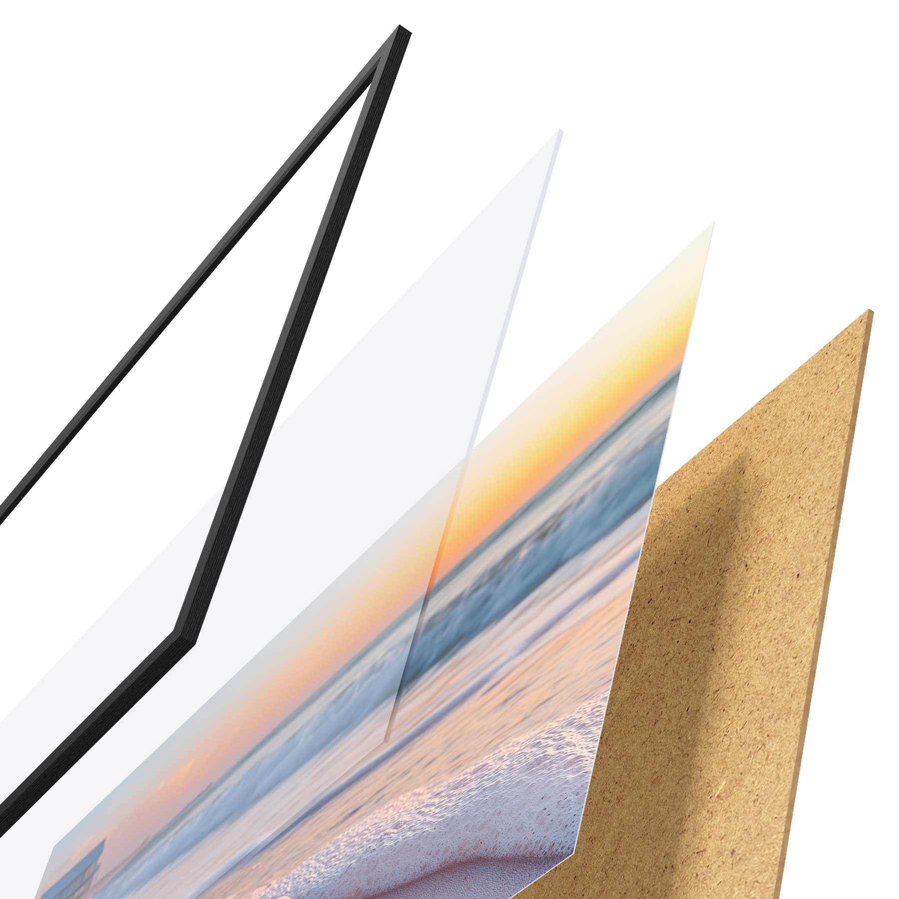 De poster bestaat uit een frame, plexiglas, geprinte afbeelding en spaanplaat achterkant. De poster kan meteen aan de muur worden gehangen dankzij de bevestigingen op de achterkant.