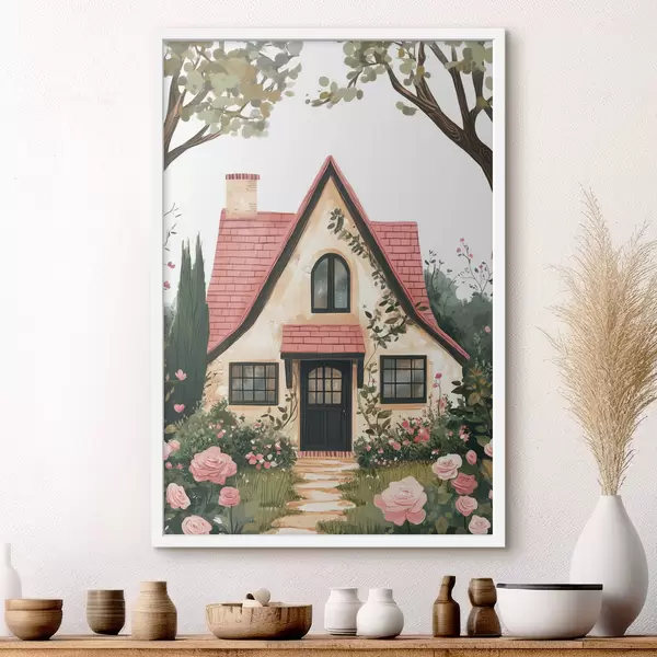 Poster Een sprookjeshuis in het bos, rozen, pastelstijl Nr f44718