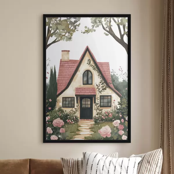 Poster Een sprookjeshuis in het bos, rozen, pastelstijl f44718
