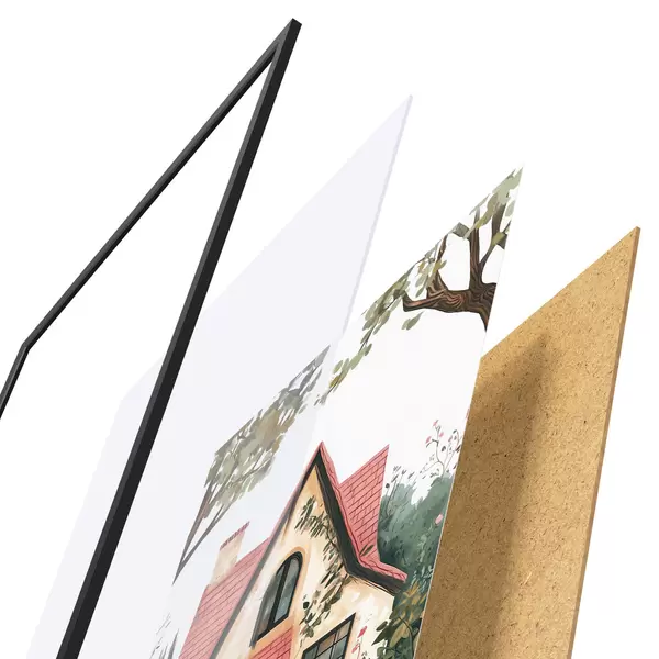 De poster bestaat uit een frame, plexiglas, geprinte afbeelding en spaanplaat achterkant. De poster kan meteen aan de muur worden gehangen dankzij de bevestigingen op de achterkant.