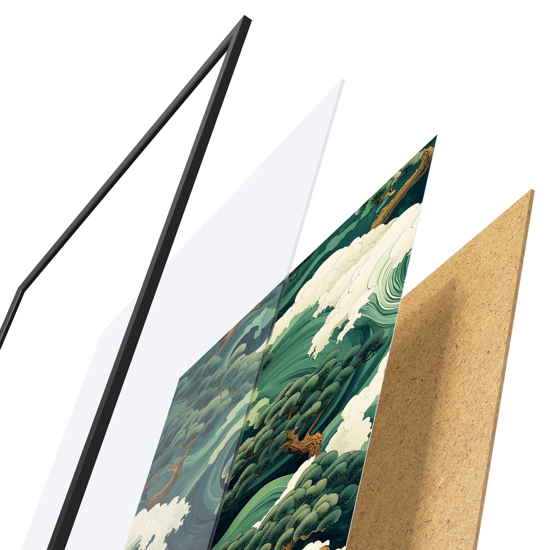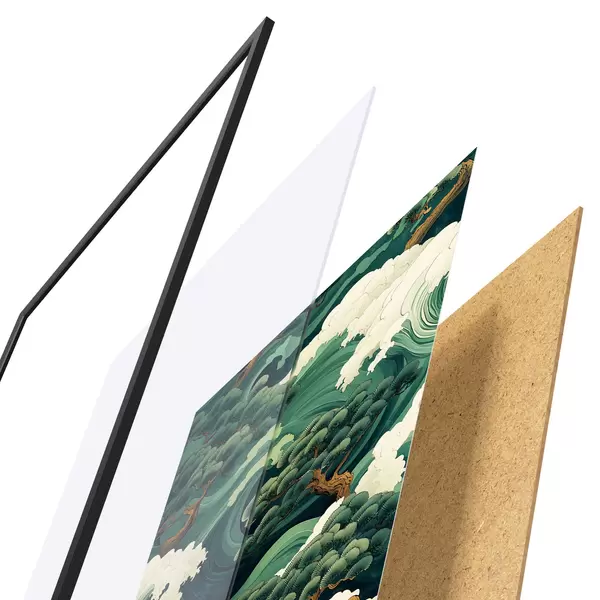 De poster bestaat uit een frame, plexiglas, geprinte afbeelding en spaanplaat achterkant. De poster kan meteen aan de muur worden gehangen dankzij de bevestigingen op de achterkant.