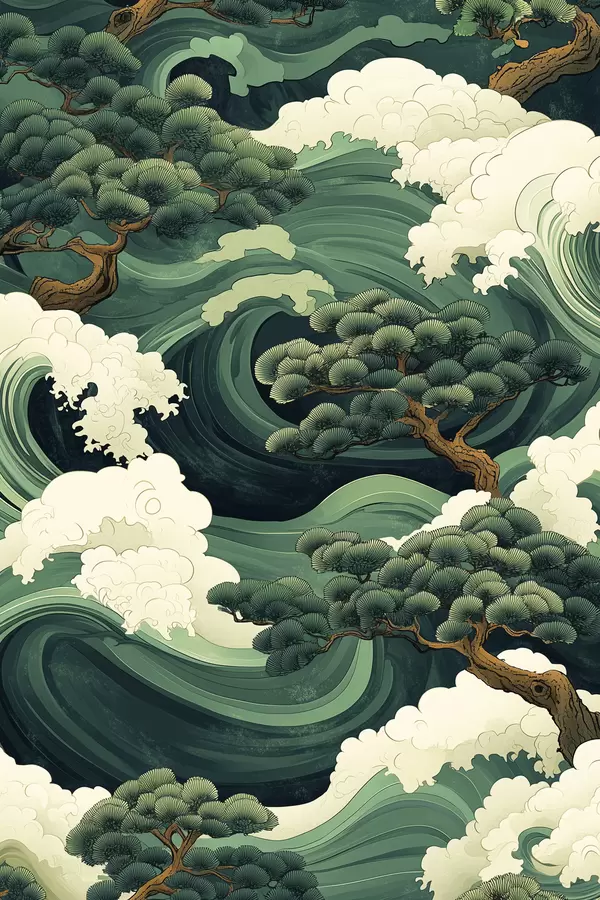 Poster Tekening in Chinese stijl met zeegolven en pijnbomen Nr f44719