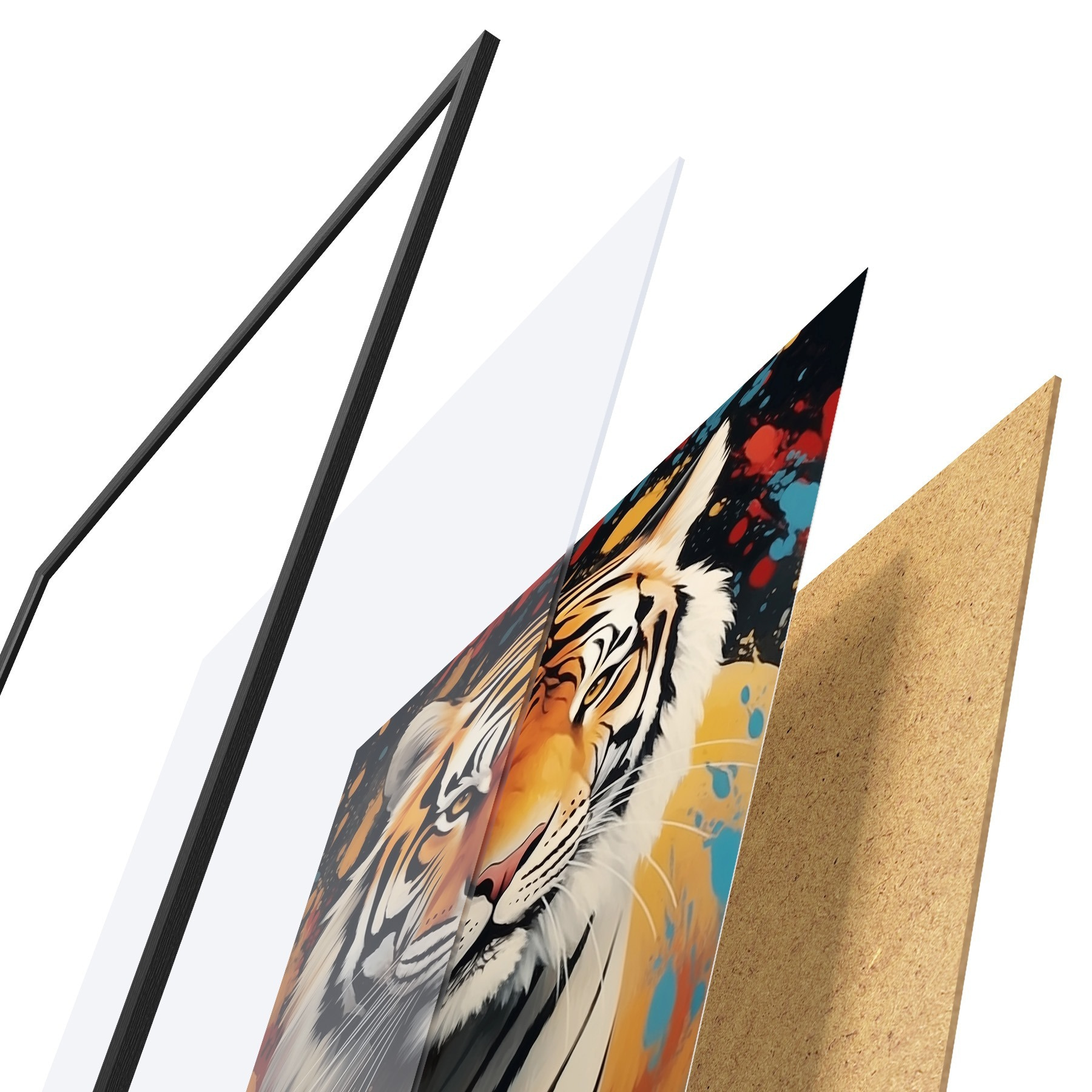 De poster bestaat uit een frame, plexiglas, geprinte afbeelding en spaanplaat achterkant. De poster kan meteen aan de muur worden gehangen dankzij de bevestigingen op de achterkant.
