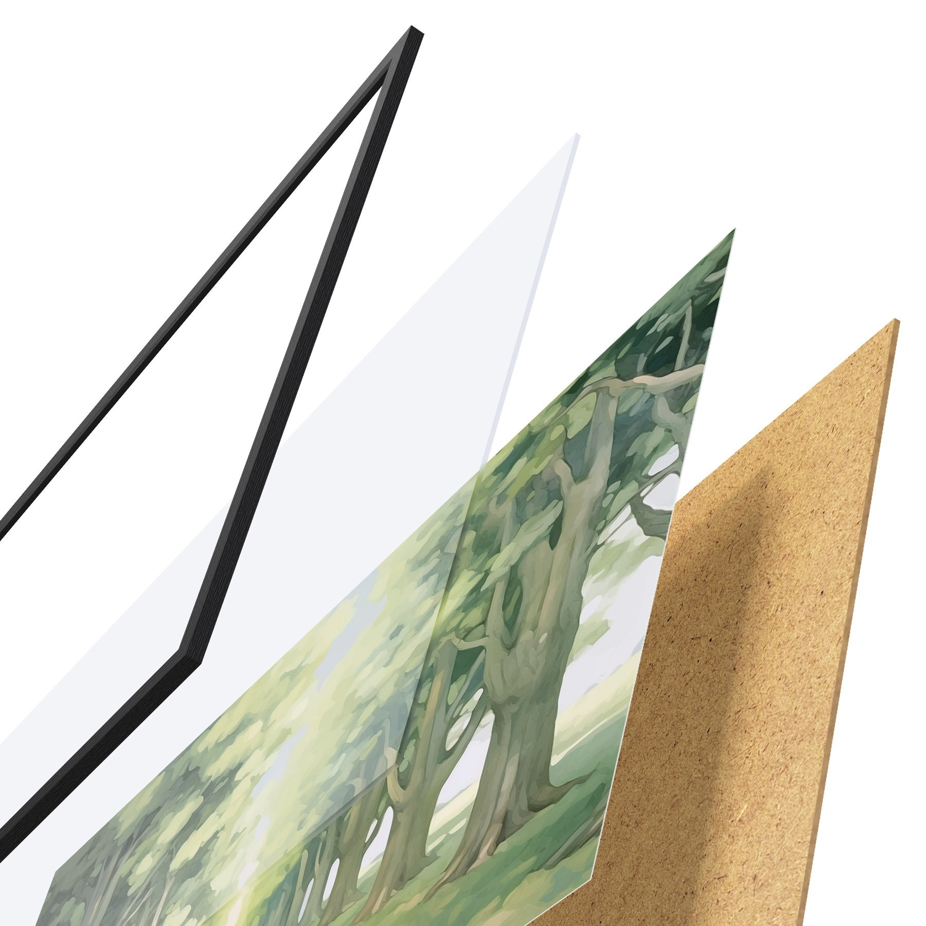 De poster bestaat uit een frame, plexiglas, geprinte afbeelding en spaanplaat achterkant. De poster kan meteen aan de muur worden gehangen dankzij de bevestigingen op de achterkant.