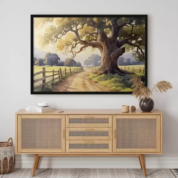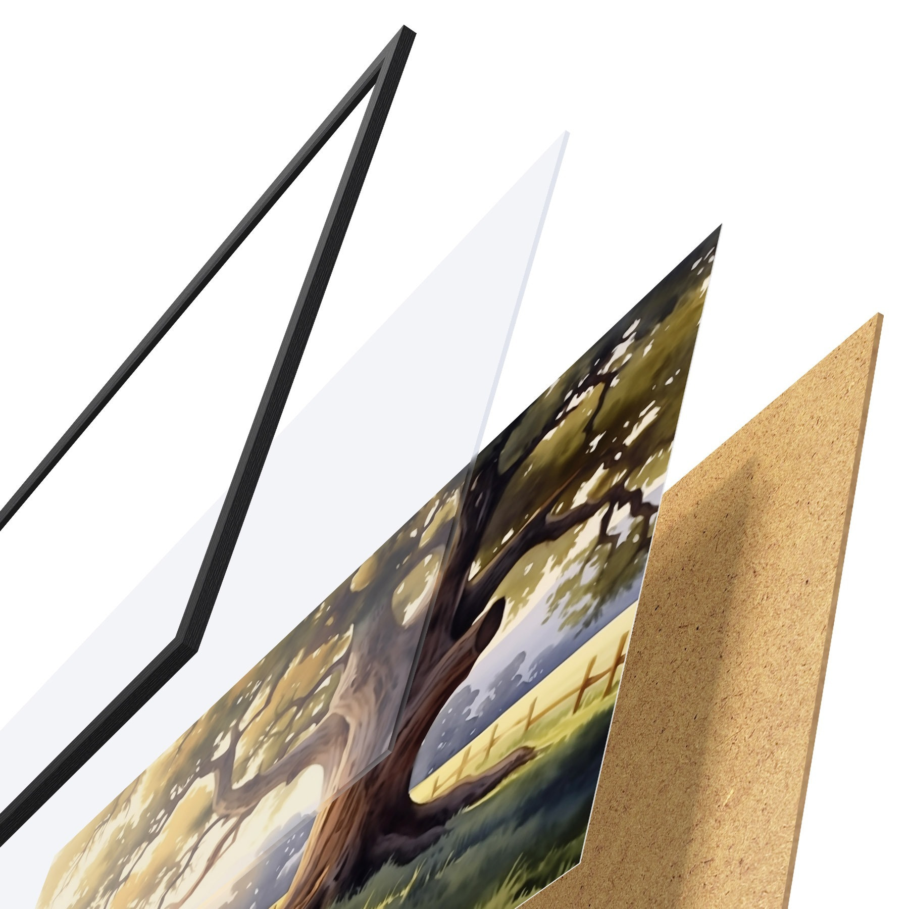 De poster bestaat uit een frame, plexiglas, geprinte afbeelding en spaanplaat achterkant. De poster kan meteen aan de muur worden gehangen dankzij de bevestigingen op de achterkant.