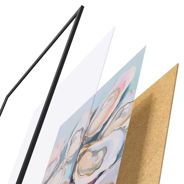 De poster bestaat uit een frame, plexiglas, geprinte afbeelding en spaanplaat achterkant. De poster kan meteen aan de muur worden gehangen dankzij de bevestigingen op de achterkant.