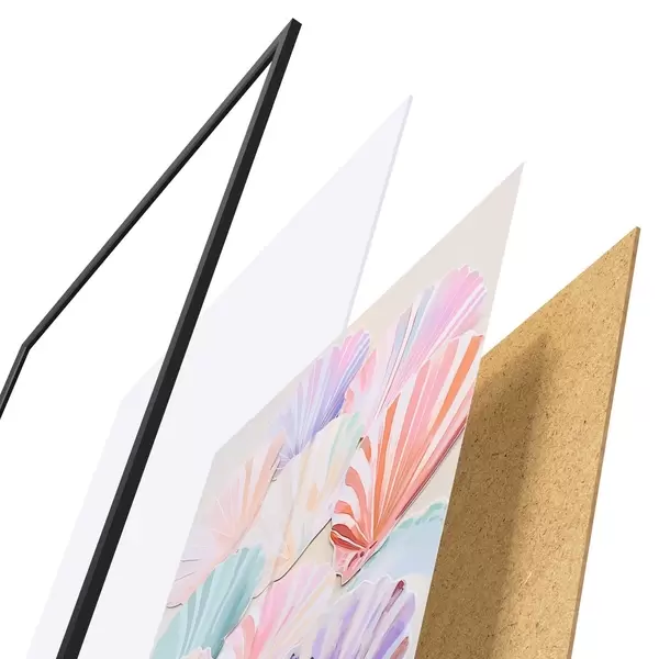 De poster bestaat uit een frame, plexiglas, geprinte afbeelding en spaanplaat achterkant. De poster kan meteen aan de muur worden gehangen dankzij de bevestigingen op de achterkant.