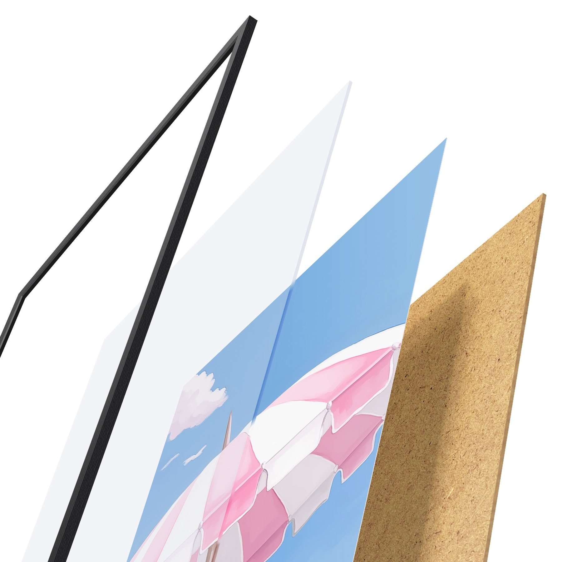 De poster bestaat uit een frame, plexiglas, geprinte afbeelding en spaanplaat achterkant. De poster kan meteen aan de muur worden gehangen dankzij de bevestigingen op de achterkant.