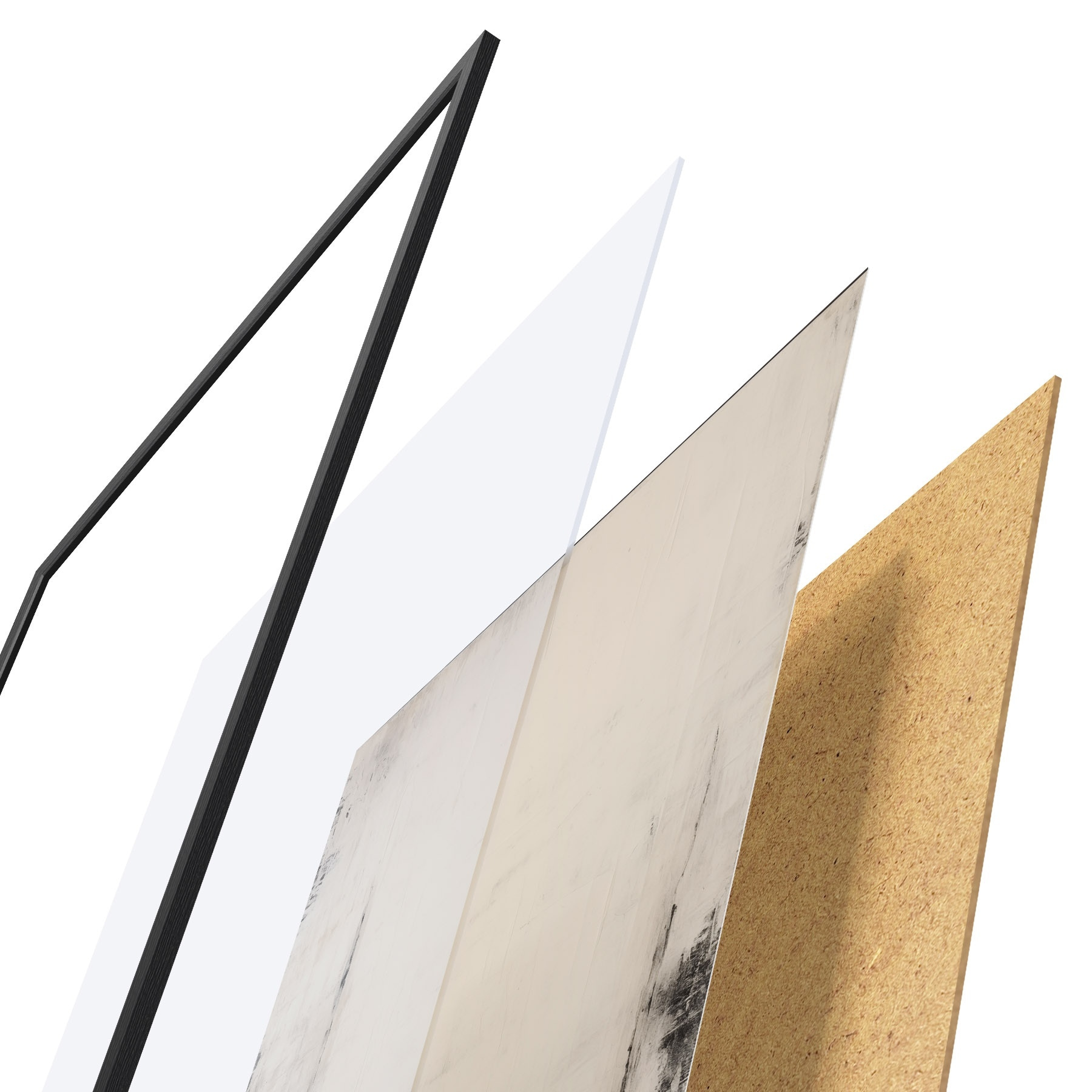 De poster bestaat uit een frame, plexiglas, geprinte afbeelding en spaanplaat achterkant. De poster kan meteen aan de muur worden gehangen dankzij de bevestigingen op de achterkant.