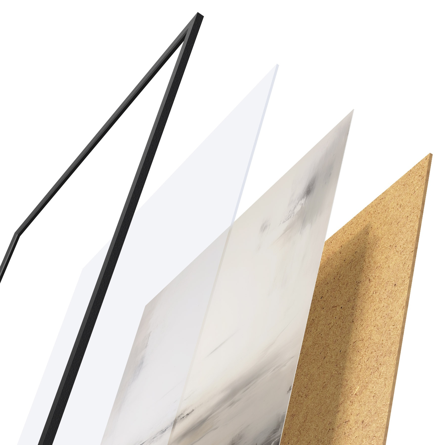De poster bestaat uit een frame, plexiglas, geprinte afbeelding en spaanplaat achterkant. De poster kan meteen aan de muur worden gehangen dankzij de bevestigingen op de achterkant.