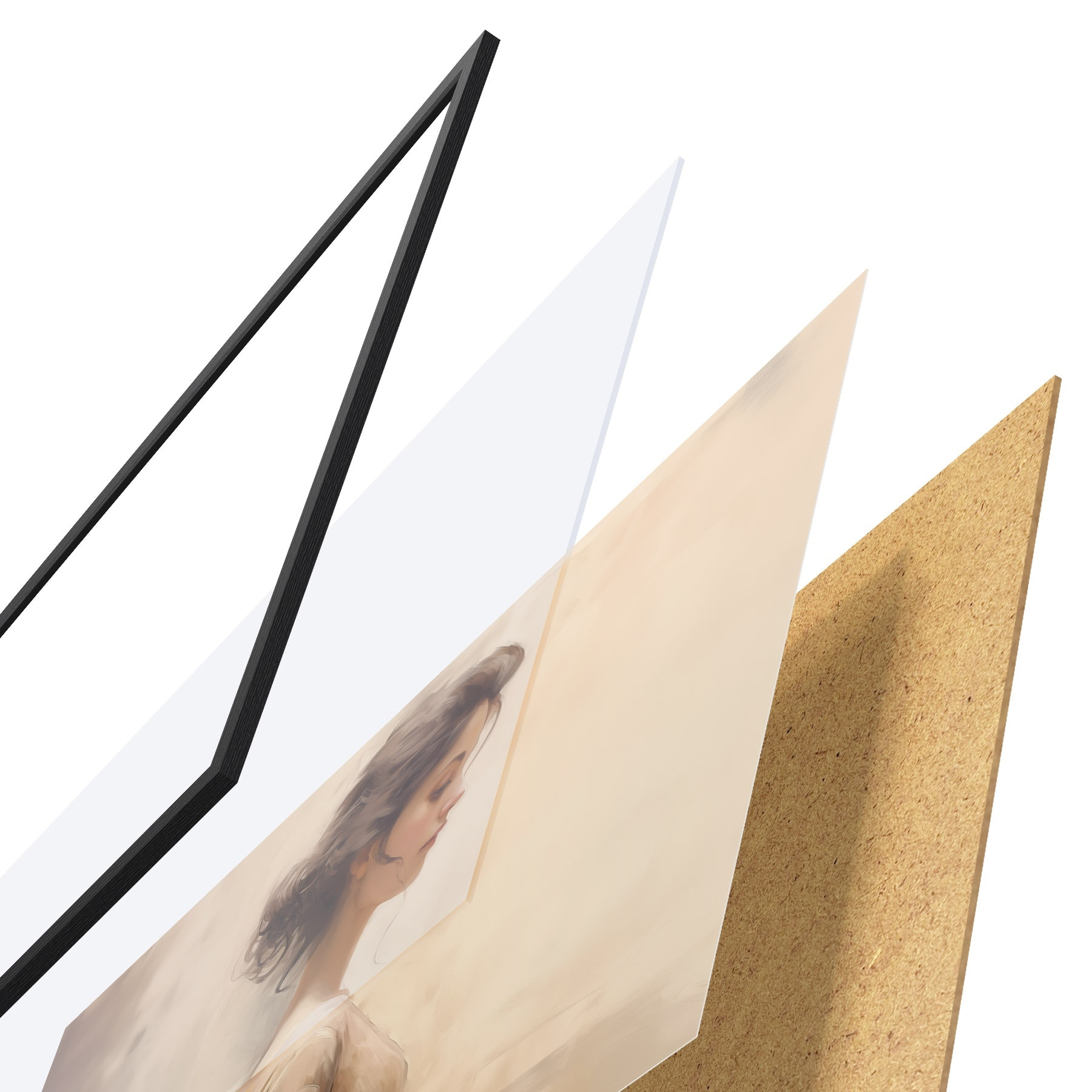 De poster bestaat uit een frame, plexiglas, geprinte afbeelding en spaanplaat achterkant. De poster kan meteen aan de muur worden gehangen dankzij de bevestigingen op de achterkant.