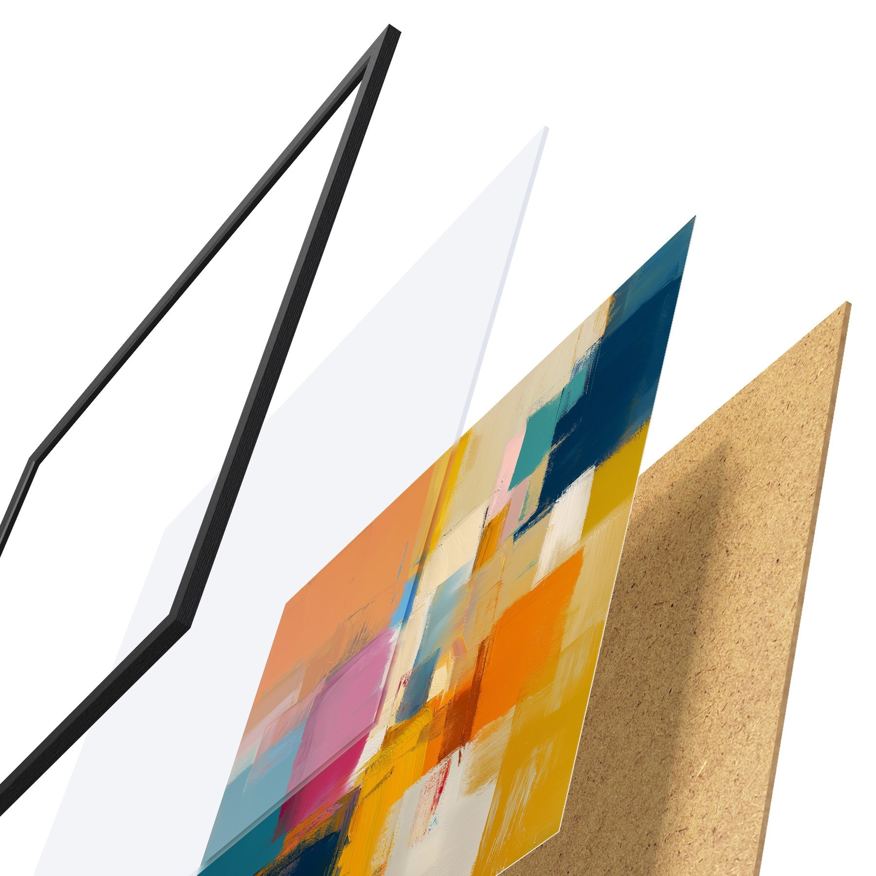 De poster bestaat uit een frame, plexiglas, geprinte afbeelding en spaanplaat achterkant. De poster kan meteen aan de muur worden gehangen dankzij de bevestigingen op de achterkant.