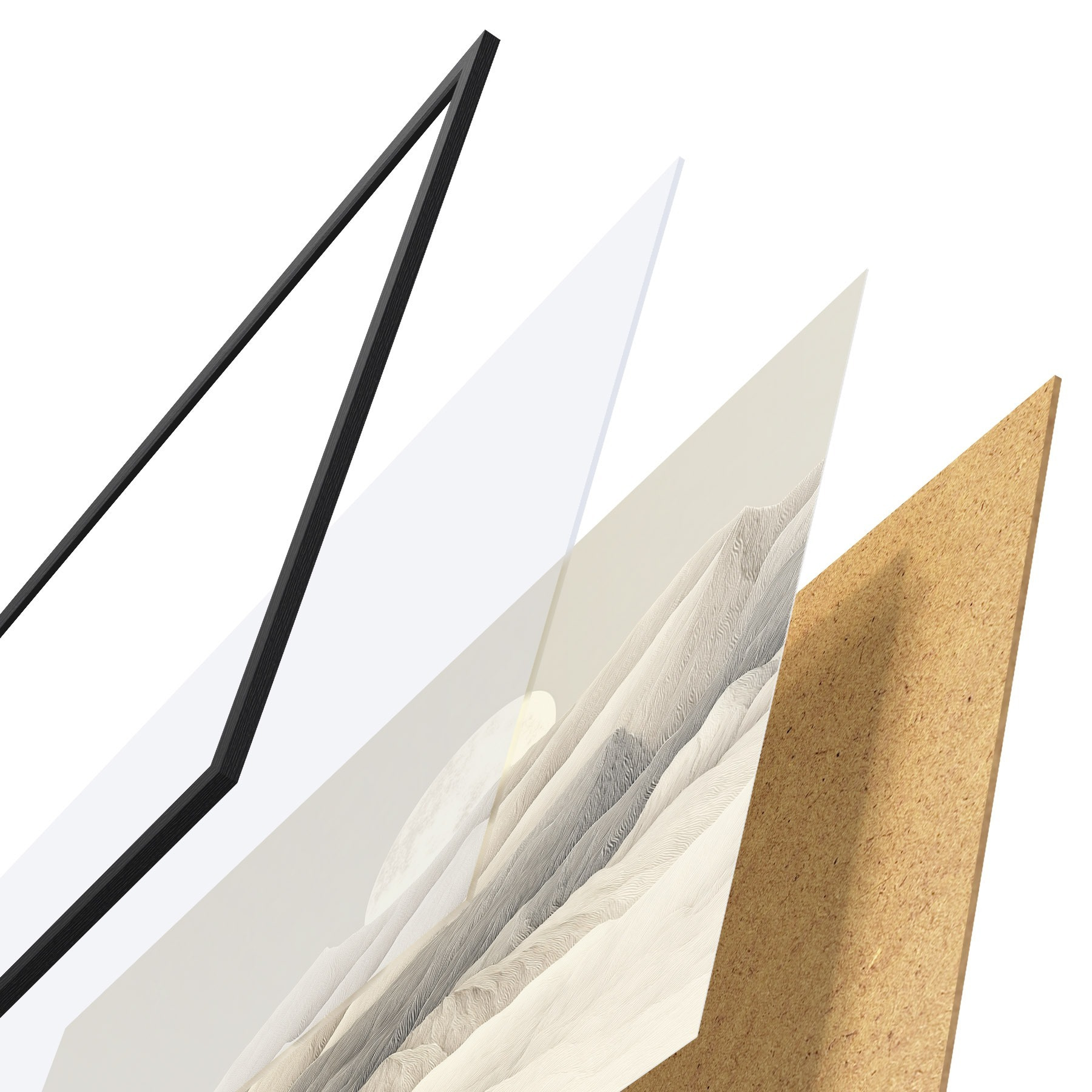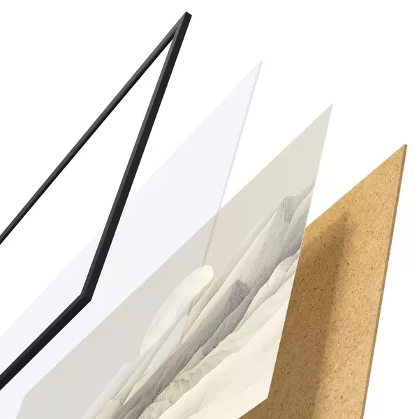 De poster bestaat uit een frame, plexiglas, geprinte afbeelding en spaanplaat achterkant. De poster kan meteen aan de muur worden gehangen dankzij de bevestigingen op de achterkant.