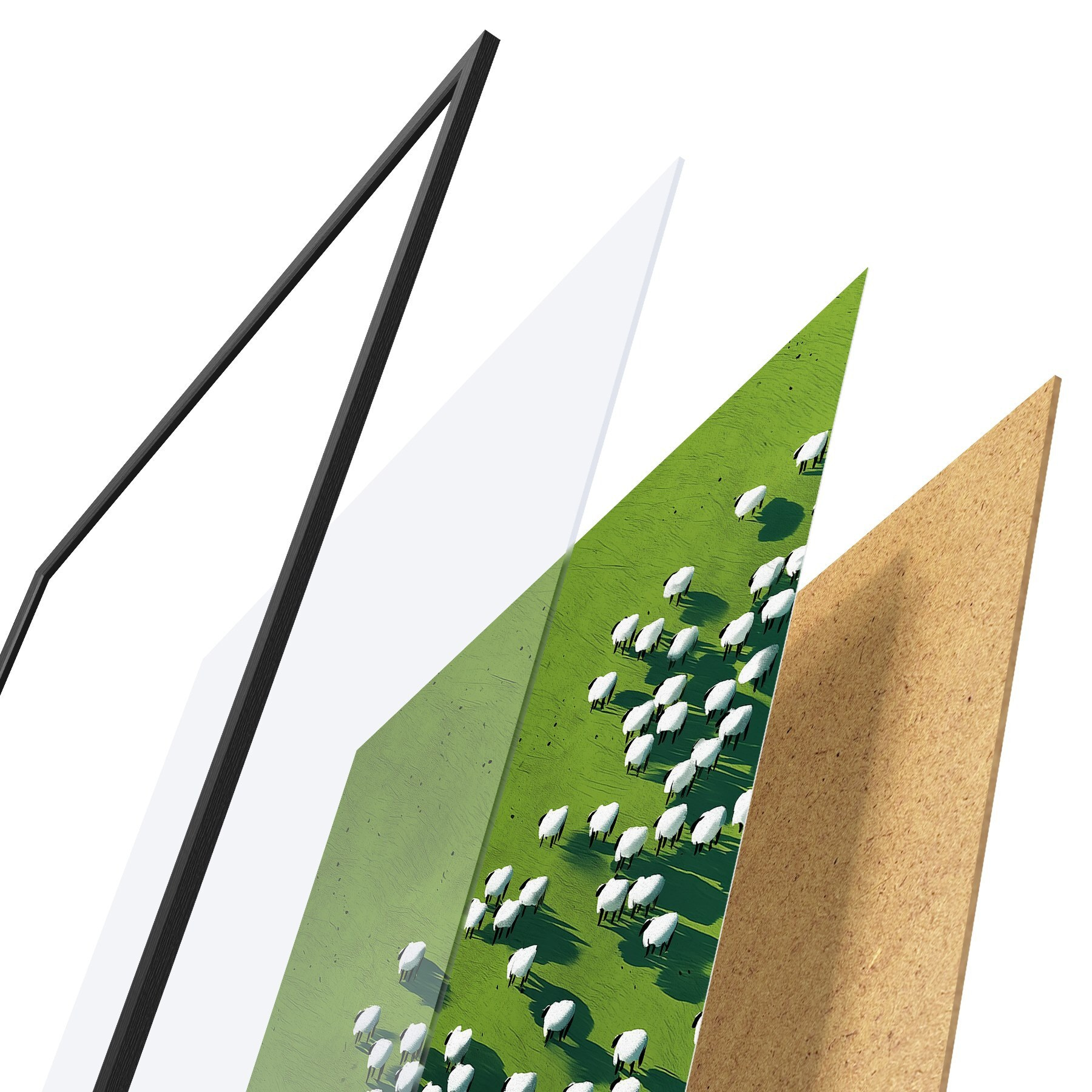 De poster bestaat uit een frame, plexiglas, geprinte afbeelding en spaanplaat achterkant. De poster kan meteen aan de muur worden gehangen dankzij de bevestigingen op de achterkant.