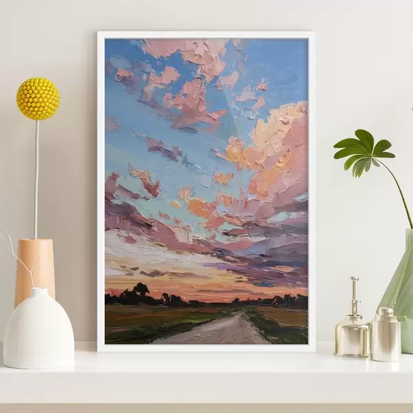 Poster Zonsondergang hemel, weg in het veld, levendige penseelstreken, olieverf stijl imitatie f44795